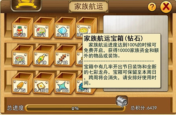 (3)家族航运宝箱新增宝石、装饰物等随机产出奖励,其中投放了部分圣诞节和万圣节装饰,以及全新装饰七彩龙舟。