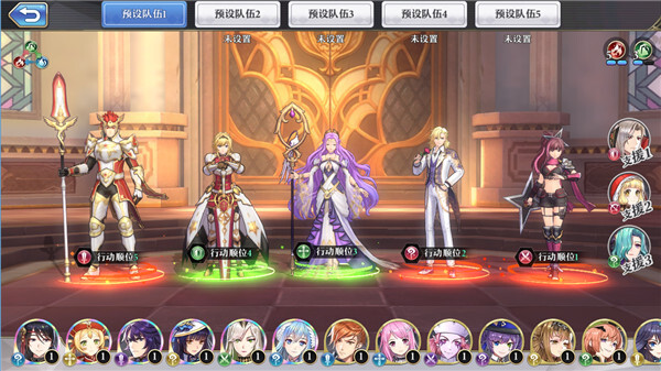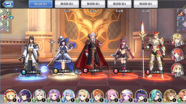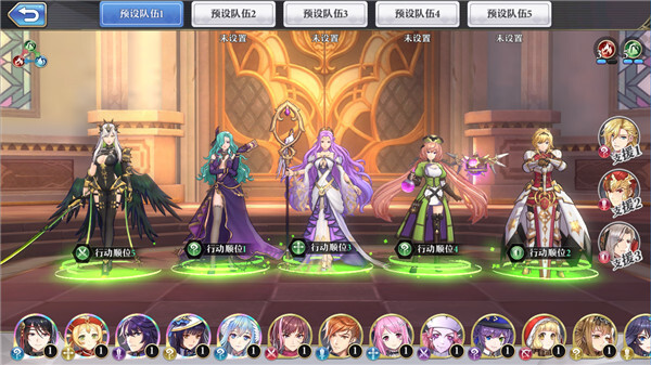 每次参与战斗时,设有5个上阵位置和3个支援位置。阵容的整体搭配逻辑为“5+3”模式,也就是说要将所有位置都填满。