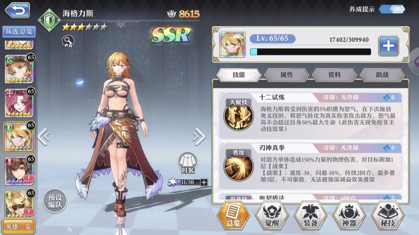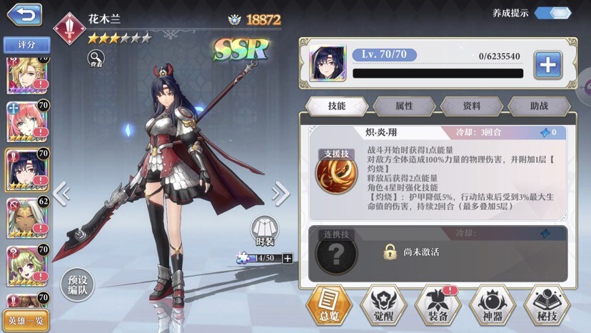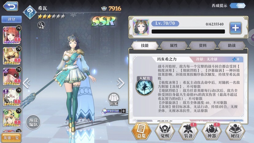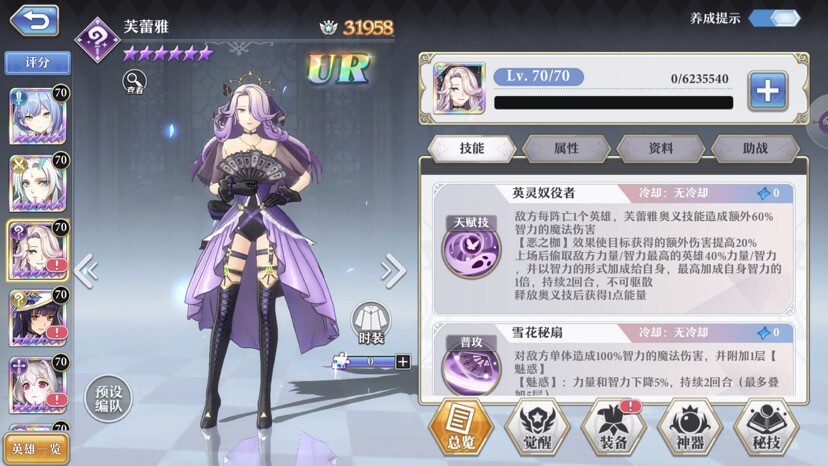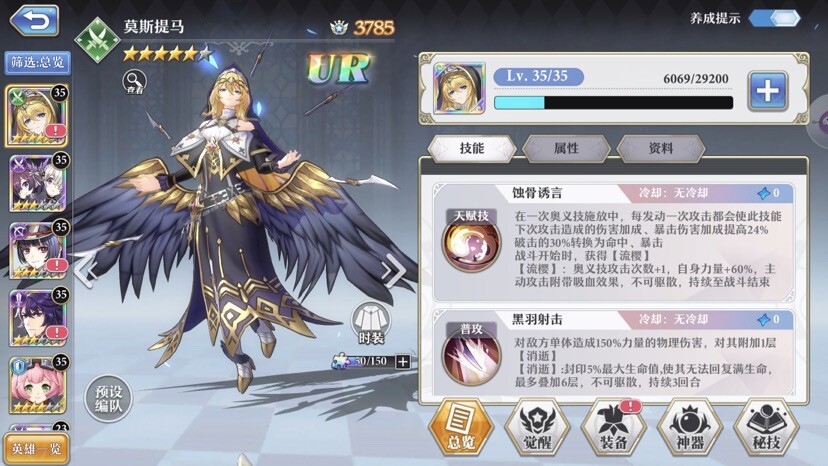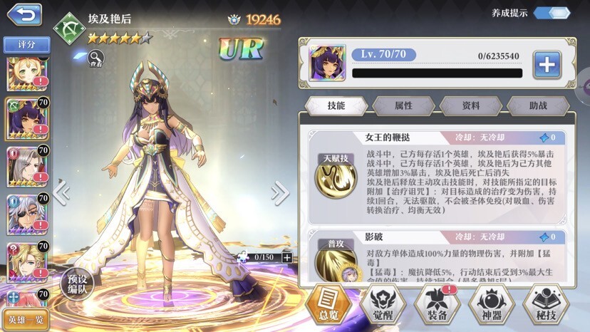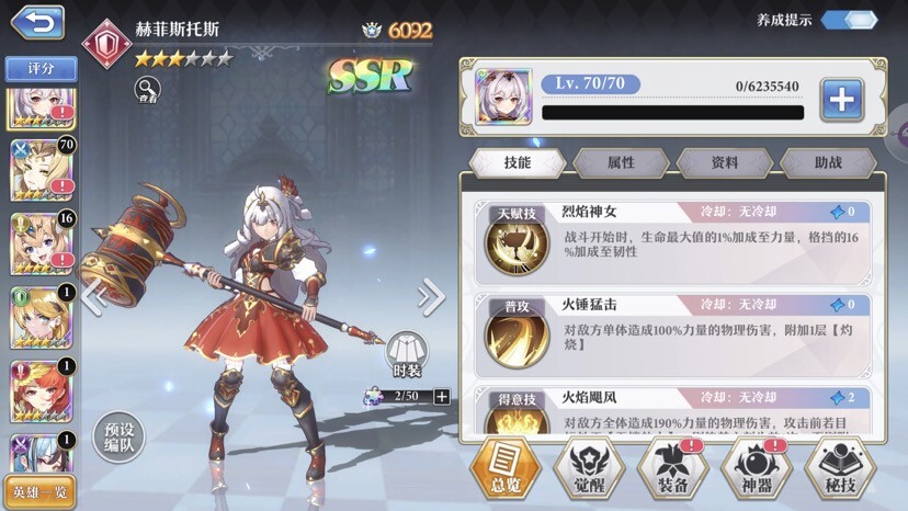 地系第一法师,培养指数四颗星。因为现在强力法师很多所以退居到三线,不过依然很强。前期没更好的法师的时候可以培养后期用来助战。优势场合:推图。