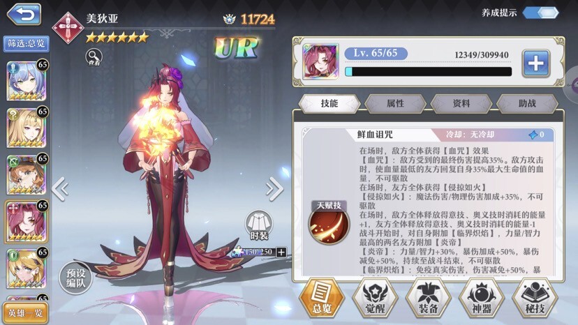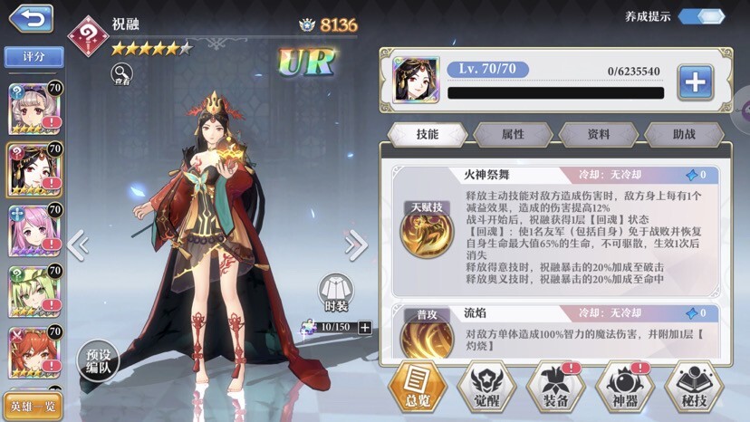 火奶,培养指数五颗星。优点:强大的增伤辅助,减少友方能量消耗,增加敌方能量消耗。缺点:没紫破的时候只给友方增加输出,没有增加队伍整体防御。需要配合其他防御辅助或肉盾使用。优势场合:适用于各种副本。