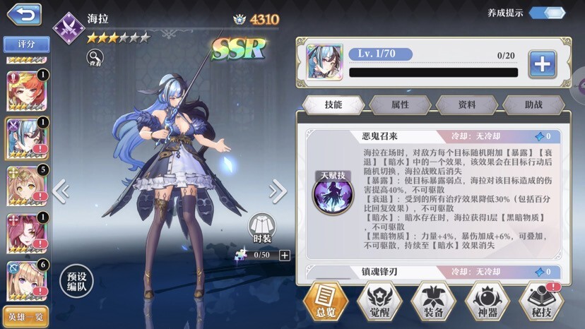 水系第一刺客,培养指数四颗星。推图能力较强,前期没有海拉和新地刺的时候可以培养后期转助战。