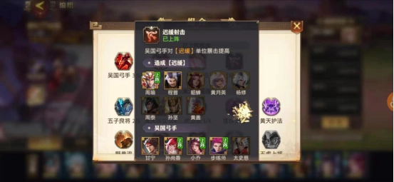 这套阵容以周瑜为军师,围绕七位核心武将构建:甘宁、孙尚香、小乔、步练师、太史慈、孙坚、黄盖,可激活所有吴国弓兵的羁绊加成。其中,孙坚能提升全体吴国武将的输出能力,当敌方首领处于迟缓状态时,还会进一步增加吴国弓兵的暴击率,并让我方对迟缓状态下的敌将造成更高伤害;黄盖的作用是为目标施加迟缓效果,同时在与吴国武将协同作战时,能增强自身的生命回复能力。作为军师的周瑜,不仅能强力强化所有弓手单位,也具备对敌方首领施加迟缓状态的能力。