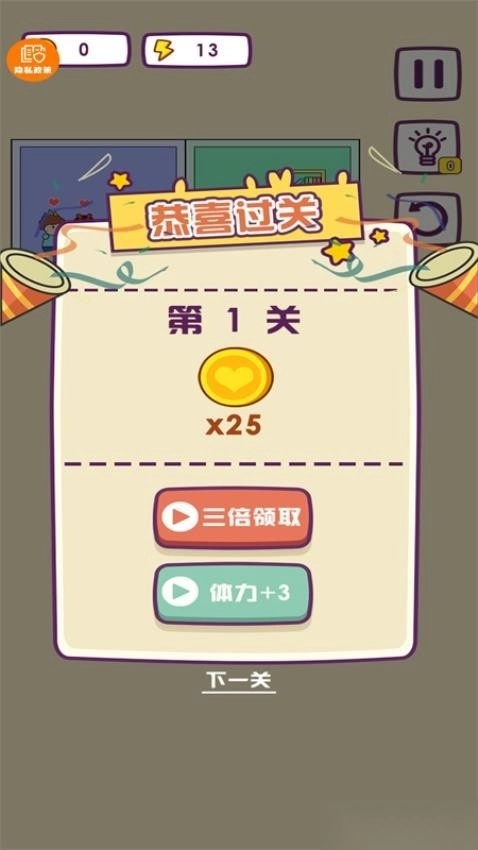 1、设置金币奖励机制,顺利通过当前的关卡挑战即可获取金币