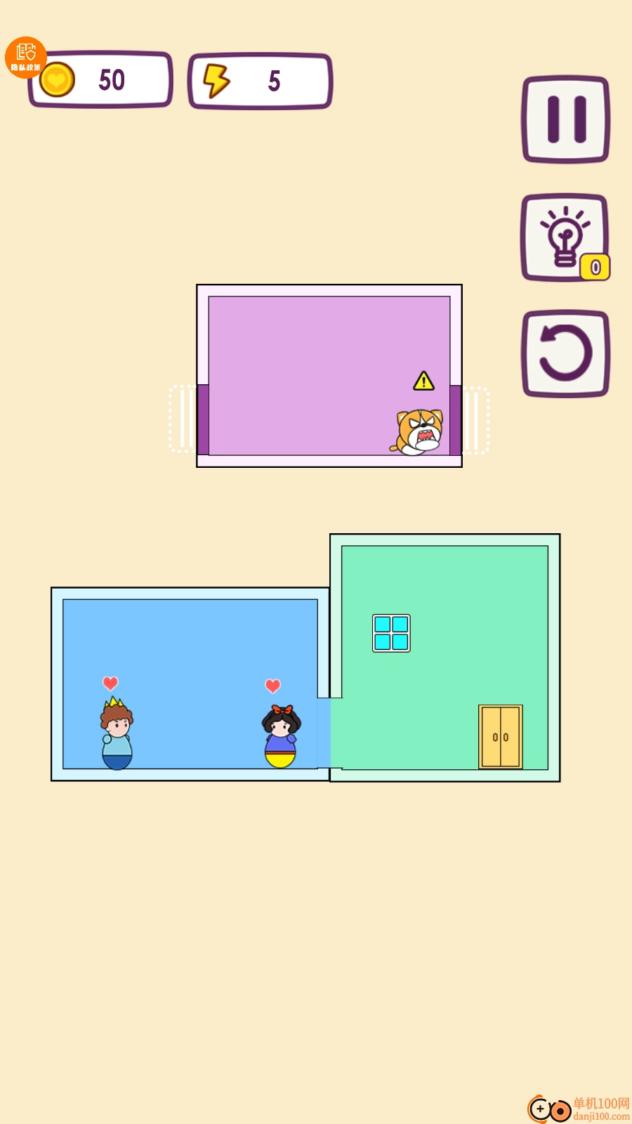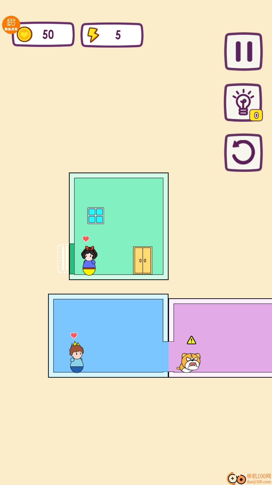 6、这一关卡里有一只狗,得先把狗安置到别的房间,之后再把公主和王子的房间安排在一块儿。