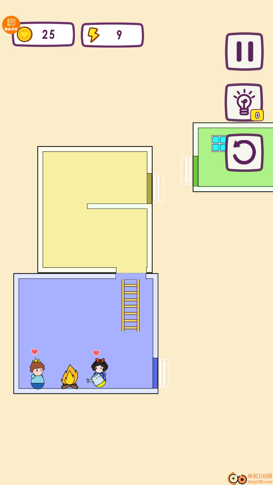 游戏里要让两个角色相遇,得用到对应的道具才行;就像碰到火焰时,得先把火焰灭掉,他们才能成功相遇。