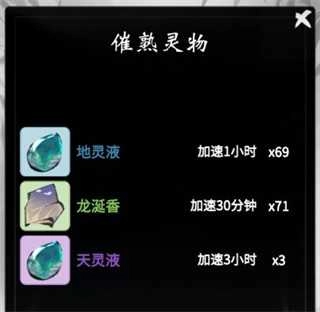 借助“地灵液”“龙涎香”与“天灵液”这类道具,能够让灵植的生长进程变得更快,使用这些道具没有次数上的限制,不过每一次使用道具的时候,都只能针对其中的某一种灵植来促进它成熟。
