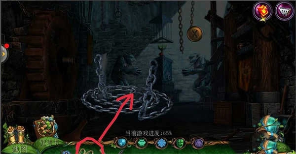 出来后,把【带镣铐的链子】放置在左边的矮人身上;接着点击左边的【矮人】,就能拉开右边机关的石板。