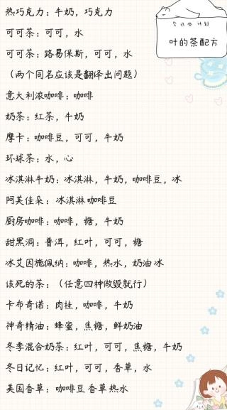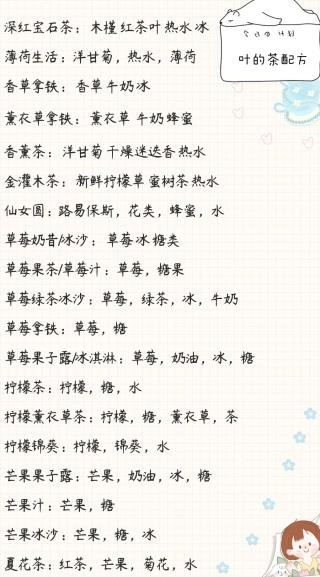 介绍了红茶、迷迭香、薄荷、柠檬草、烂茶叶、鲜茶叶、乌龙茶、帮助花瓣、勇敢茶等茶叶及相关饮品的配方