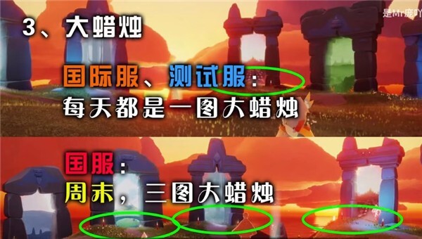 国际服与测试服每日仅开放一个地图的大蜡烛,而国服在周末会有三个地图的大蜡烛。因此,国服在蜡烛上限和烛火数量方面,相比国际服拥有显著优势。