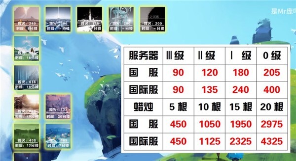烛火数量方面,国际服与测试服采用同一套标准,国服则单独使用另一套标准。这套标准制定于2021年,如今或许存在些许偏差,但整体差异应该不大。需要说明的是,国服和国际服合成蜡烛所需的烛火数量并不相同,国际服合成一根蜡烛要比国服多消耗不少烛火。另外,国际服每日蜡烛获取上限为20根,国服则在26到27根左右。