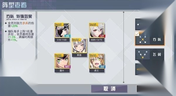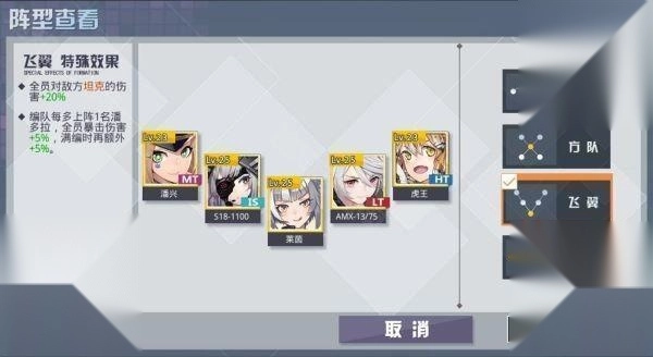 现在我主要用的阵型是飞翼,毕竟它满编状态下能给全员增加10%的暴击伤害。虽然之前玩其他游戏时听过一个梗:99%的暴击率约等于0,但我就是偏爱这种碰运气的感觉——万一运气好呢?用这个阵型时我搭配的是1111编队,这个编队能为全队提供12%的火力、耐久、破甲和护甲加成。在全员各项属性都有基础加成的前提下,额外的10%暴击伤害堪称锦上添花,直接就能实现暴力输出了。