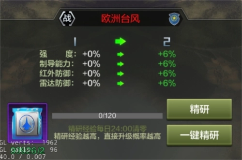战机精研是通过消耗精研芯片提升精研等级的培养方式。精研等级会按百分比强化战机及战机武器,因此越强的战机越适合进行精研;另外,精研每次会消耗一定数量的精研芯片,且积攒的精研进度在次日会重置为零(精研等级不会改变),所以在进行精研前,建议先确保拥有充足的精研芯片。