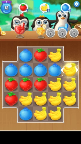 1、游戏界面清新可爱,主要元素是憨态可掬的企鹅与色彩缤纷的水果。
