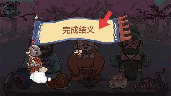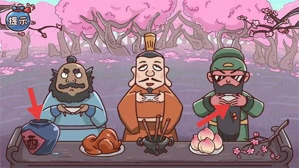 进入桃园场景后,桌上摆放着酒坛、烧鸡和桃子等物品。按照提示为人物倒酒,促使他们筹备结义仪式,以此推动游戏进程。