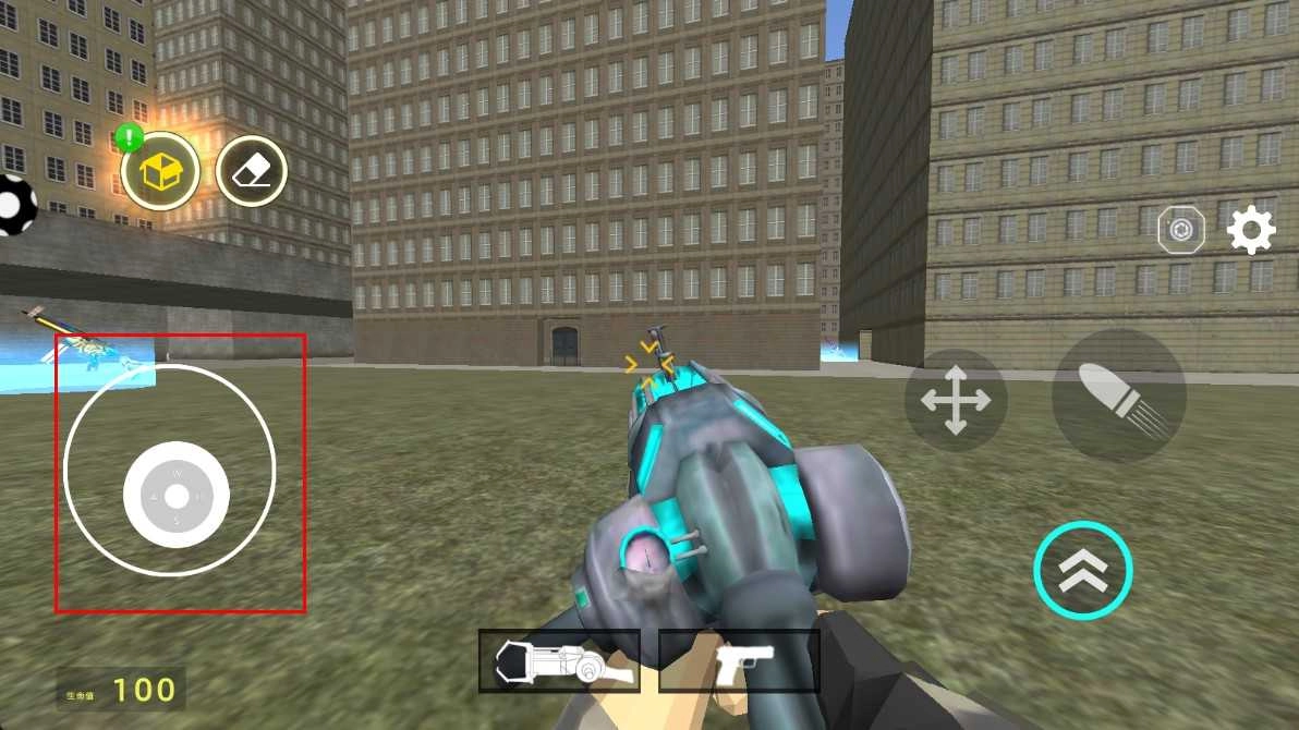 在城市射击场景中,通过操控左侧的虚拟摇杆,可控制角色在城市空地移动、自由穿梭,以便寻找射击目标或探索区域。