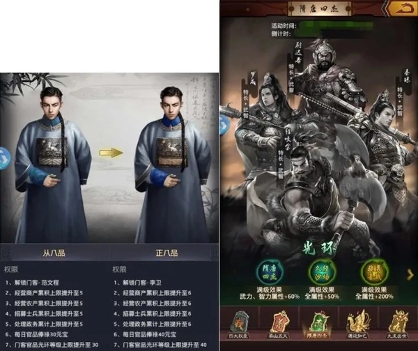 门客的光环有通用光环和专属光环两类。通用光环能够提升门客的全属性值,在演武堂、一骑当千这类演武玩法里能获取功勋值,消耗功勋值就能升级通用光环,从而增加属性。