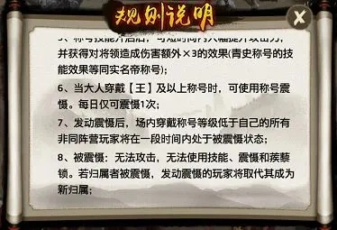在副本“全军出击”里,称号的效果会更加强劲!要是大人拥有王及以上级别的称号,就能额外解锁技能——不仅能在短时间内让攻击力得到大幅提升,还能触发一次称号震慑;发动震慑后,场内所有称号等级低于您的非同阵营玩家,都会陷入无法发起攻击的震慑状态;而处于该状态的玩家如果原本有归属关系,发动震慑的您将直接取代原归属者,成为他们新的归属对象。