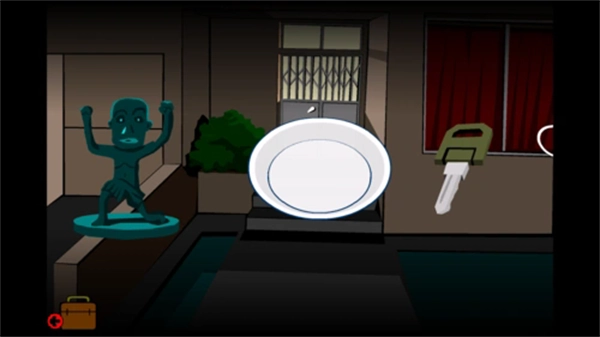 回到刚进屋时的界面,也就是从一楼洗手间出来的位置,点击向后箭头,用蓝绿色钥匙打开左侧那扇蓝绿色的门。中间桌子的花瓶里有浅灰色钥匙,另外还能看到架子上摆着一个绿色的小石像。