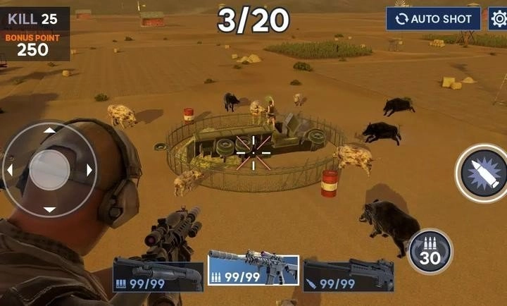 直升机野猪狩猎射击挑战游戏,游戏以上帝视角制作,在这里你需要在远处对各种动物和生物进行狩猎,可以选择的武器种类很多,还有各种大范围攻击的黑科技可以使用,还会应对不同的敌人,喜欢的话快来进行体验吧!