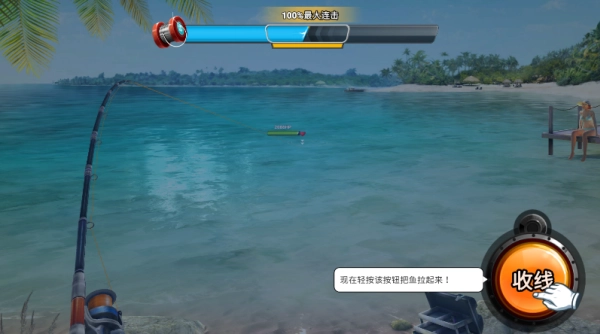 接着轻按收线按键来将我们钓到的鱼给拉起来。