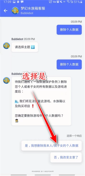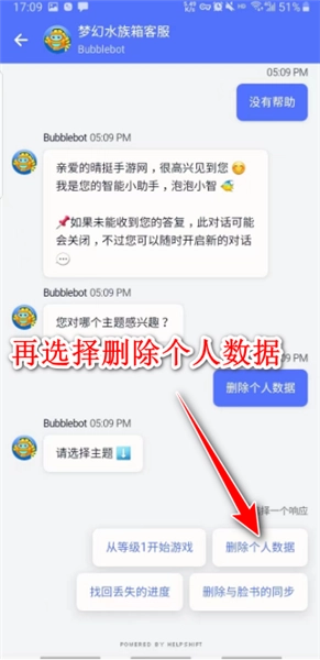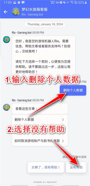 在输入框中填写“删除个人数据”后,系统仍由机器人进行响应,接着在后续选项里点击“没有帮助”。