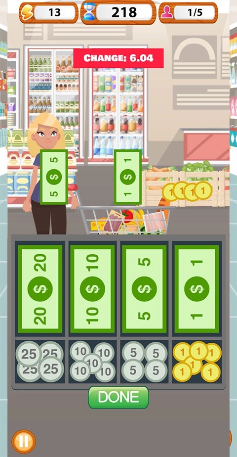 3、通过计算找零并从收银机中取出金币,试试自己能不能顺利闯过超市收银的所有关卡。