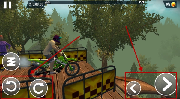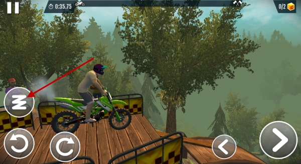 1、进入游戏后,屏幕左下角的两个按键用于控制摩托的前倾与后仰,右下角的两个按键则可操控摩托前进和后退。