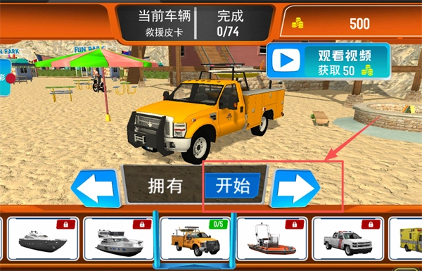 可以点击画面下方中间位置带有红色救援驾驶模拟器字样的标题区域,也可以留意沙滩救援相关的场景元素。