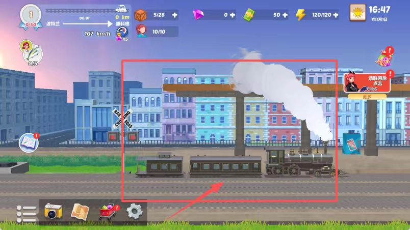 查看蒸汽火车行驶的画面,等左上角的进度条达到要求后,就去看右上角的时间;或者留意提示框,等它提醒需要联网时,再进行点击操作。