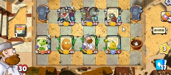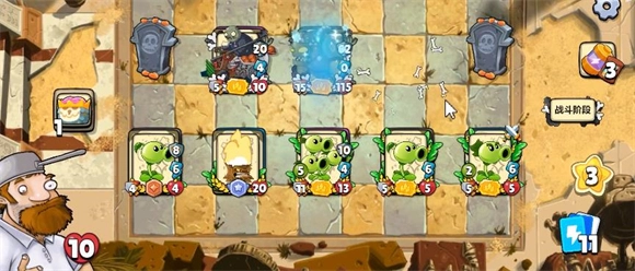 2、开局先按常规方式展开,要是抽到三重豌豆就直接放在中间作为核心输出点,后续只需持续为它提升攻击力并确保其存活即可。