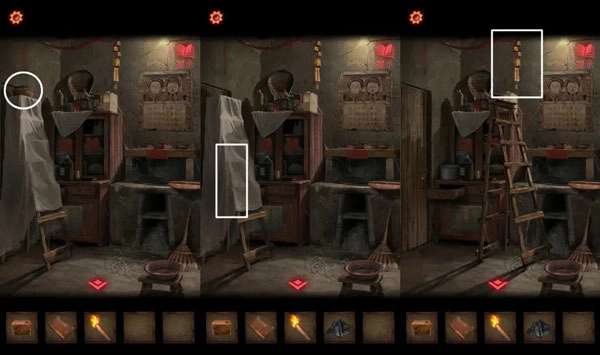 通过梯子爬上高处拿到【煤炭】,先点击梯子上的布料,接着把梯子挪到中间,之后触碰天花板上挂着的铃铛来启动机关。