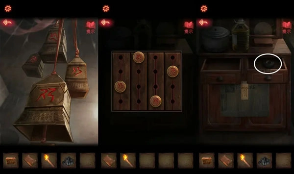 根据铃铛上符号的高低排列顺序,解开抽屉的密码锁,得到【胶布】。
