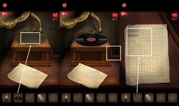 把地面上摊开的油纸伞收起来(要留意别吓到旁边的孩童)。把【唱片】放进留声机里,转动侧面的把手让它播放音乐,同时用【铅笔】轻轻点触歌词纸,跟着节奏互动。