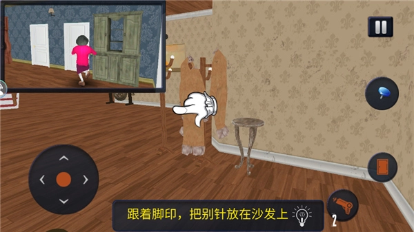 跟着脚印,吧别针放在沙发上。