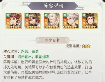 养成思路:重点培养赵云与黄忠,这样能迅速解决敌方后排单位,有效缓解我方防御端的压力,剩下的三名角色保持均衡培养就可以了。