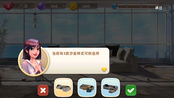 3、目前有3种沙发款式可供挑选,选定后点击右侧的对勾按钮就行。