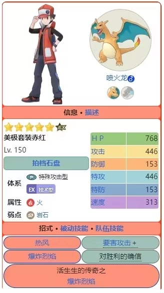 赤红&喷火龙:老牌火系输出。比较大的问题是BUFF链太长、拍招因为mega效应导致拍招的基础伤害很低。虽然开了五宝盘和开放吃蛋糕后附加技术型,但是我相信只有老玩家的喷火龙是三宝以上,很多小伙伴应该很多跟我一样,一开始选御三家就选了喷火龙,结果从来都没上场过,毕竟火系上位强的很多了,而且普池的炎武王实力也不差,所以喷火龙是不建议自选。推荐指数:一颗星。