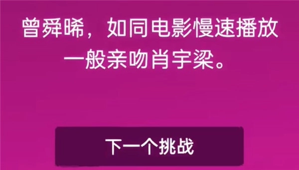 4.最后再看这类大冒险相关的问题,比如让曾一吸(玩家可自行在游戏中取名,此处为小编虚构)像电影慢镜头那样轻吻萧宇梁,其实难度不算特别高,只是实际操作起来会有点挑战性,但能增进情侣间的感情,非情侣玩家建议不要尝试!