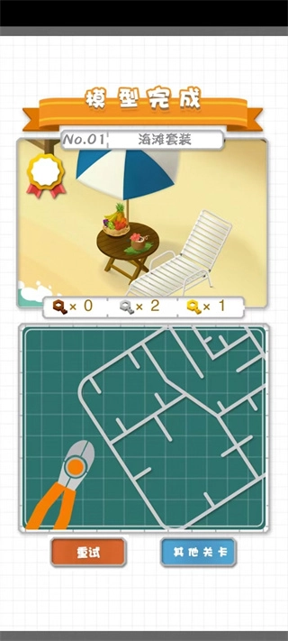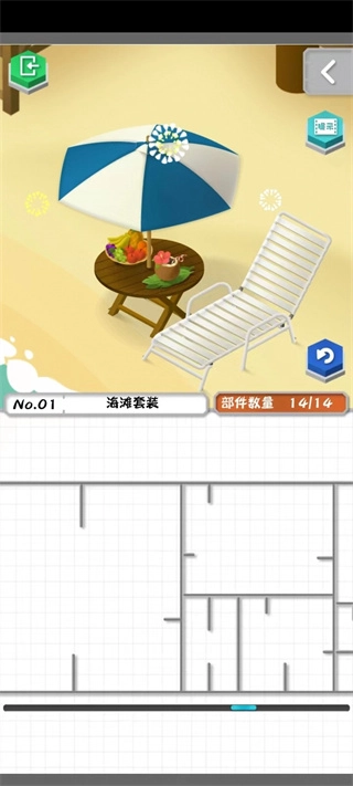 进入关卡后,你会看到待拼接的海滩套件。画面中会出现若干方形图案,这些是沙滩椅和桌子的支撑脚,你可以先将它们摆放到位。