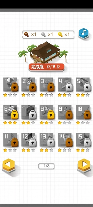 首先,玩家安装好游戏并打开后,会看到三把钥匙,每把钥匙对应着一个难度不同的锁,玩家可以借助这些钥匙解锁各个关卡。