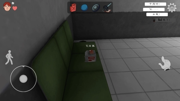 2、玩家需借助地图内的道具逃离此处,点击右侧“手”形图标拾取道具,点击左侧人形图标可实现下蹲动作。