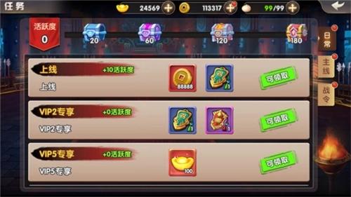 任务系统分为日常、主线、回购,日常任务与主线任务可以产出队伍经验、体力、铜钱、招贤令、将魂、经验丹、元宝等物品,不同点在于日常任务可每日更新,主线任务需要玩家通过冒险副本完成,但完成后依旧会放出大量资源。日常任务是最重要的升级方式!