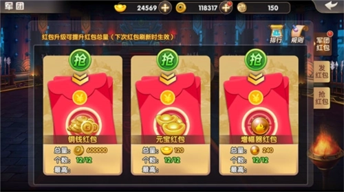 彩头中分为军团红包,发红包,抢红包三个面板,军团红包和抢红包都是可以领取到铜钱、元宝、神器的,不要让自己感觉像错过了几个亿的红包,快加入一个门派吧!