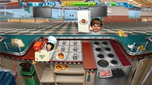 2、当你制作的牛排已经烤焦了,可以点击牛排并将它移动到垃圾桶里面。你需要完成关卡开头给与你的目标指数,这样就可以达成今天的业绩要求了。