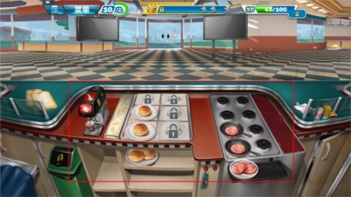 1、打开游戏,进入关卡1。根据客人的口味,选择汉堡包,然后将牛排放入到汉堡包里面,最后将食物递给顾客。顾客吃到自己想要的食物,就会给与金币和小费在桌子上,你需要点击桌子上的货币来获取。
