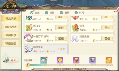 在《神雕侠侣2》中,玩家们可以通过任务、战斗、活动来获取经验值,而其中在日常活动中,有一项上限次数为10的专门刷经验的活动,宝塔型的图标,旁边有上升箭头的经验,名字就叫“修行”!可谓很直观了,而在“修行”中,玩家们可以根据自己等级,在古墓三层任意选择一层,再加上多倍经验丹,然后在加上自动巡逻和战斗,根本不用自己管,经验就会滚滚而来!那么,下面就给大家介绍一下神雕侠侣2修行活动,也就是古墓修行的玩法。
