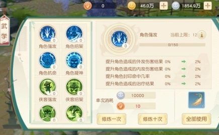 修炼能够提高角色、侠客和宠物的百分比属性,其上限取决于人物等级。每次进行修炼都要消耗银币、帮贡、秘参、鹿茸、灵芝等资源。