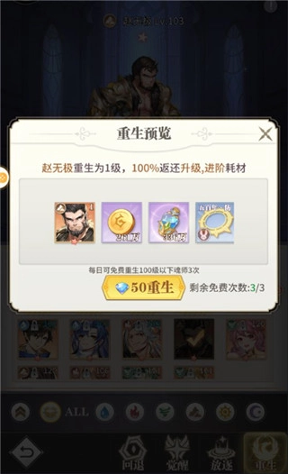 重生就像是等级归零,就算养错了魂师卡也不用慌——你可以在武魂殿对指定魂师进行重生操作。重生后,该魂师的等级会回到1级,同时系统会返还培养时消耗的金币、魂师经验以及外附魂骨。需要注意的是,重生仅会改变魂师的等级,其星级和阶数都将保持不变。关于重生的规则:每日有3次免费机会,可用于重生100级以下的魂师;若要重生100级及以上的魂师,则需要消耗钻石。