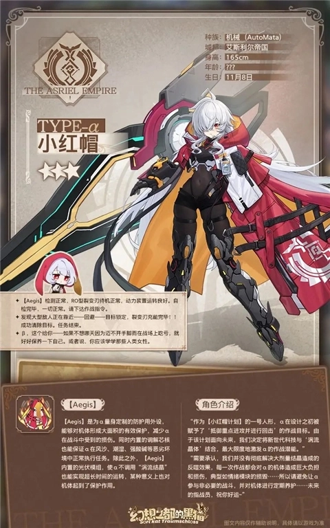 作为【小红帽计划】的一号人形,α在设计之初被赋予了‘抵御重点进攻并进行回击’的作战目标。由于该计划面向未来,我们决定将新世代科技与‘涡流晶体’结合,最大限度地激发α的作战潜能。”