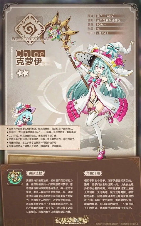 相较于其他小仙子,克萝伊是比较另类的。通常,仙子们会主动远离人类,以免发生意外和不必要的冲突。只有克萝伊经常出没在人类的城邦,无论街道、餐厅还是商店,都有她的身影。但她最常拜访的还是穷苦善良的孩子们。新鲜出炉的面包、香喷喷的火鸡、甜蜜的糖果、可口美味的姜饼……只要是孩子们的愿望,它都能用神奇的魔法来实现。